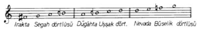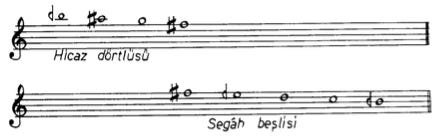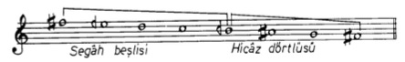 Segâh beşlisine katılan Hicaz dörtlüsü en ziyade duraktan daha aşağıya doğru yüründüğü zaman meydana çıkar: