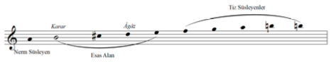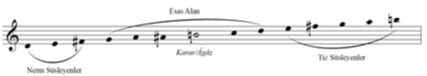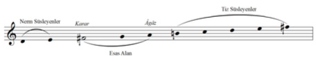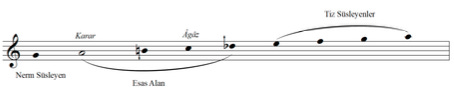 Dügâh perdesinden āgāz [başlar] ve rāst ve ırāk perdesine hübūt idüb [inerek] anda [orada] karār ider. Ammā dügâh perdesinden yukaru segâh ve çargâh ve nevā ve hüseynî ve evc perdesine dek ve ırāk perdesinden aşağı aşîrān ve yegâh perdesine dek seyri vardır… (Başer, 2013, s.127)