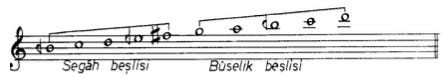 Segâh beşlisinin, diğer beşlilerden (Ferahnâk, Hüzzâm, Nikrîz, Pencgâh) farklı olarak dörtlüsü, tam dörtlü mesafesindedir. Sonuna tanini aralığı eklenmek suretiyle beşli olmuştur.