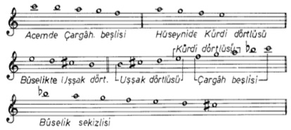 Perde-i nevādan āgāz idüb [başlayıp], hüseynî perdesi andan [oradan] yine nevā ve hicāz perdesi ile būselik perdesine gelüb anda [orada] karār ider. Ammā hüseynî perdesinden yukaru acem ve gerdāniyye ve muhayyer ve tîz segâh ve tîz būselik perdesine dek ve būselik perdesinden aşağı dügâh perdesine seyri vardır. (Başer, 2013, s. 117)