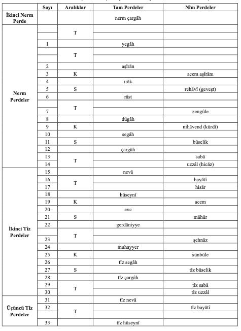Sazdaki perdeler, nermden tîze doğru aşağıda tabloda verilmiştir. Perdeler arasındaki mesafelerin anlaşılması için ayrıca tabloya aralıklar eklenmiştir.2