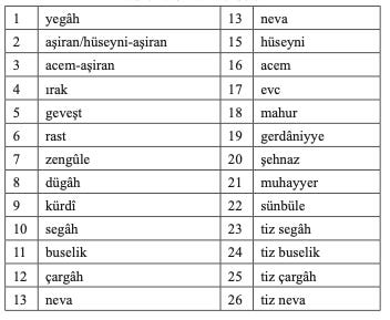 24’lü sistemle birlikte bazı tam ve nim perdelerinde isim değişikliğine gidildiğinden yukarıda bahsedilmişti. Son dört asırdır ismi değişmemiş perdeler, tablo haline getirildiğinde aşağıdaki görünüm ortaya çıkmaktadır: