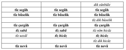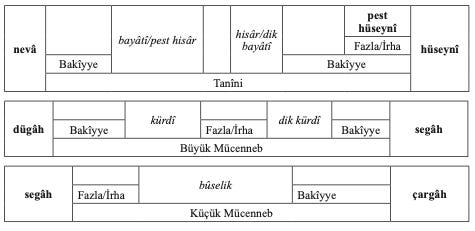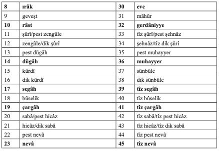 Sûznâk, Neveser, Nihâvend-i Kebîr, Nihâvend-i Rûmî, Gül’izâr, Bayâtî-Arabân, Zevk u Tarâb, Hüzzâm, Vech-i Arazbâr, Sultânî Hüzzâm, Şedd-i Arabân (Tırışkan, 2000, s. 22,33,28,30,33,34,38)