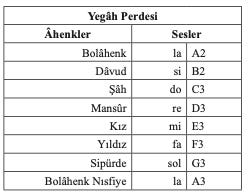 Son olarak bilinmesi gereken âhenk bilgisidir. Yani yegâh perdesinin portede hangi sese karşılık geleceğidir. 8 âhenge göre yegâh perdesinin ses karşılıkları aşağıda Tablo 13’de verilmiştir.