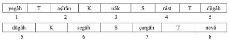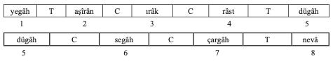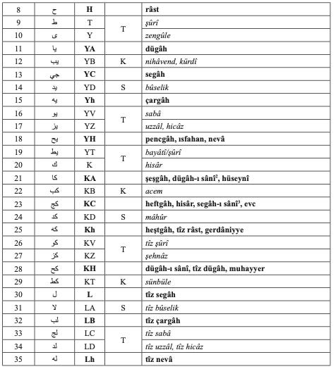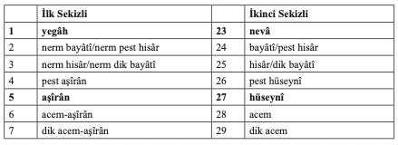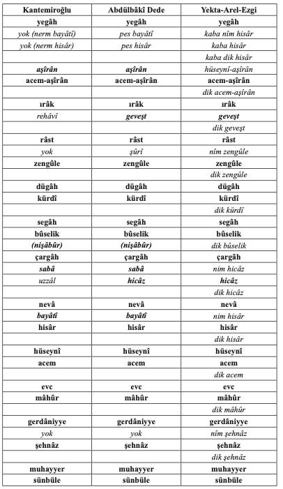 Ortak isimler kalın, sadece iki dönemde ortak olan isimler kalın ve italik ve üç dönemde de farklı olan isimler de italik karakterle yazılmıştır. Parantez içinde yazılan nişâbûr perdesi, adı geçen dönemlerde perde sıralamasına alınmamış, yan bilgi olarak verilmiştir.