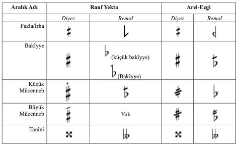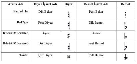 Bu aralıkların içindeki küçük değişimleri ifade etmek için tercihe göre Rauf Yekta Bey’in aralık isimleri de kullanılabilir. Fakat sade kalması ve her bir aralığa ayrı bir değiştirici işaret verilemeyeceği için aralık sayısı azaltılmıştır. Rauf Yekta Bey ikili aralıkları küçükten büyüğe doğru; Fazla, İrha, Küçük Bakîyye, Orta Bakîyye, Bakîyye, Zâid Bakîyye, Küçük Mücenneb, Zâid Küçük Mücenneb, Nâkıs Büyük Mücenneb, Büyük Mücenneb, Tanîni, Zaid Tanîni olarak sıralamıştır. (Yekta, 1924, s. 101-104)