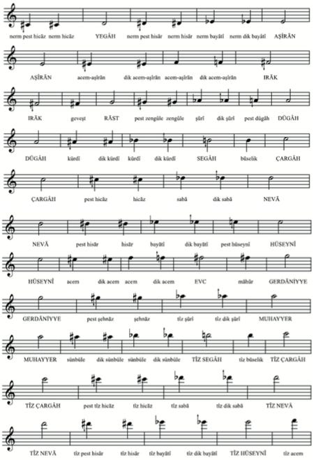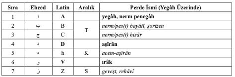 Tabloda her ne kadar nîm perdeler ve aralıklar sabit görünse de nağme içinde bunların küçük oranlarla değişeceğini hatırlatmak gerekir. Her şeyden önce aralık ve perde isimleri, bir alanı ifade etmektedirler.5