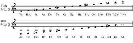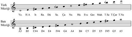 a. Bir adla anılan notanın iki müzikte farklı seste (frekansta) olması ve bu sebeple icra edilen eserlerin yazılırken portede –batı müziğine göre- asıl yerlerinin dışında yazılması