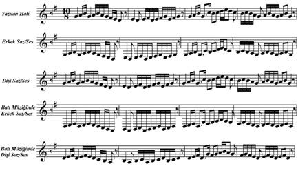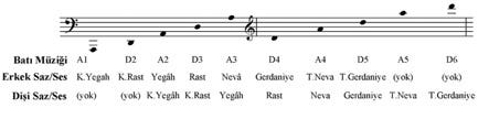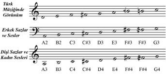 Daha önce bahsi geçen Türk müziğindeki karar perdeleri, batı ve Türk müziği erkek ve dişi sazlara göre ve “bolāhenk” düzenine göre portede şu şekilde görünmektedir;