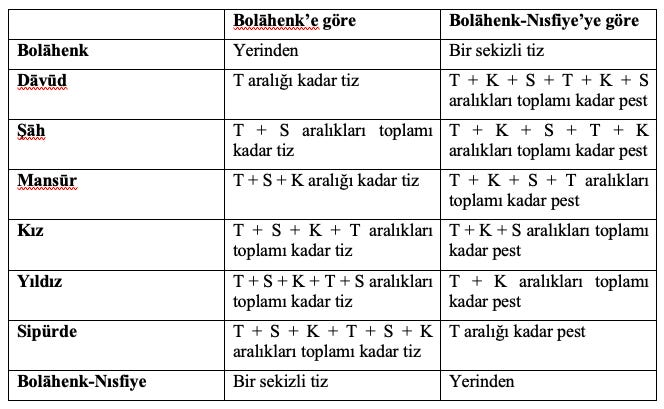 Ana düzenleri daha iyi anlamak için Bolâhenk ve Bolâhenk-Nısfiye düzeni ile kıyaslayarak tablo üzerinde gösterelim;