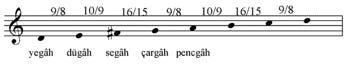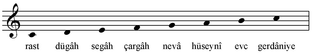 Türklerin en eski mūsikî nazariyatçısı Fārābî’nin yazdığı “Kitābü’l-Mūsikîü’l Kebîr” isimli önemli eserinde; doğu mūsikîsinin esas kabul edilen doğal perdeleri Arapça olarak verilmiş ve bu perdeler, Yunan bilgelerinin kitaplarında geçen doğal perdeler ile karşılaştırılmıştır. Bu doğal perdelerin bugünkü karşılıkları şunlardır;