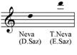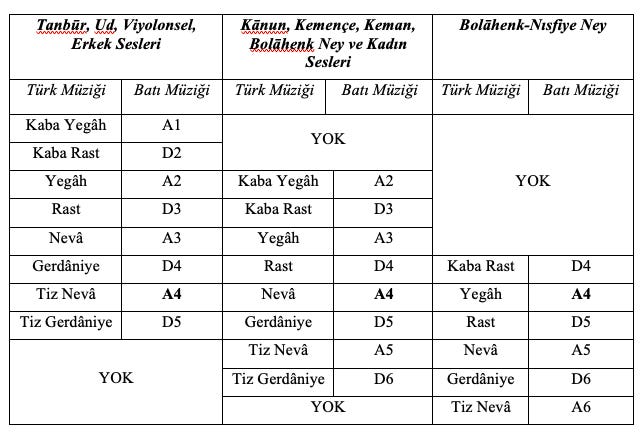 Türk müziği icracısı, sazını akortlarken “lâ” notasını “re” kabul eder ama notadan eser icra ettiğinde veya solfej yaptığında “lâ” notası yine “lâ”dır. Fakat Türk mūsikîsinde “lâ” dediğimiz nota da aslında batıda “mi” dir. Kānūn sazına göre düşünülürse; “nevā” perdesi batıda “lâ4”, “dügâh” perdesi de “mi4”e denk gelir. Yani “lâ” denildiğinde aslında batı mūsikîsindeki “mi” sesi, “re” denildiğinde yine batı mūsikîsindeki “lâ” sesi duyulur.